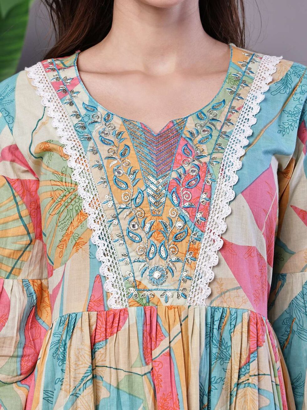 Wome’s Multicolor Printed Cotton A-Line Dress with Embroidered Yoke Midi Dresses